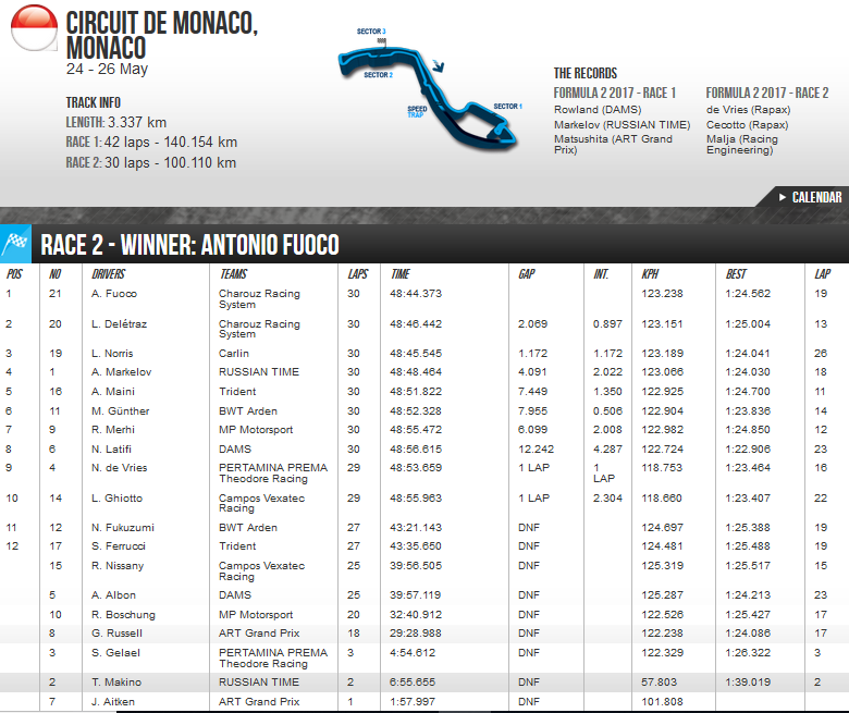 Hasil Race 2 F2 2018 Monaco